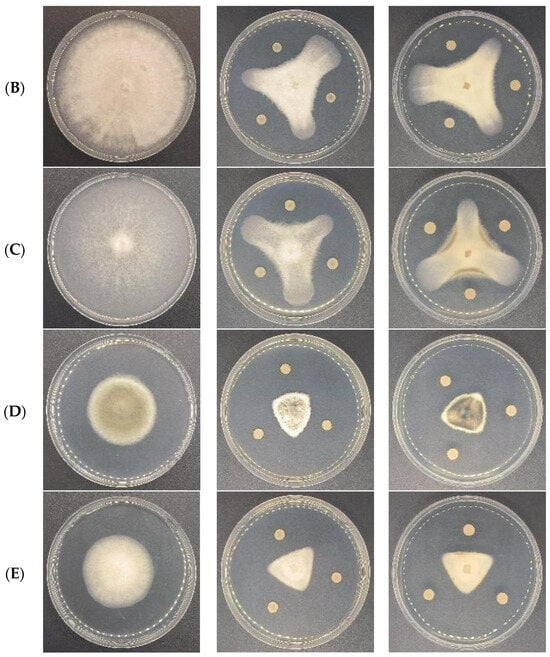 Antagonistic activities of CSUFT-BV4 against C. oleifera anthracnose in vitro. (A): C. fructicola; (B): C. gloeosporioides; (C): C. siamense; (D). C. camelliae; (E): C. kahawae.