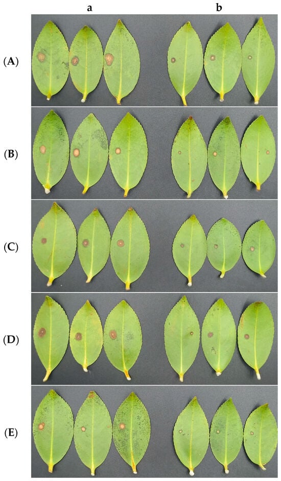 Antagonistic activities of CSUFT-BV4 against C. oleifera anthracnose in vivo. (A): C. fructicola; (B): C. gloeosporioides; (C): C. siamense; (D): C. camelliae; (E): C. kahawae. a: CK, control, inoculated with pathogens alone; b: inoculated with CSUFT-BV4 fermentation broth.