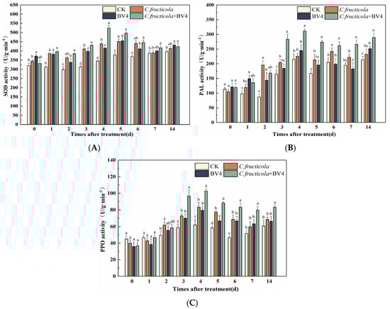Changes in defense enzyme activities in C. oleifera. (A) Superoxide dismutase SOD; (B) phenylalanine aminotransferase PAL; (C) polyphenol oxidase PPO. CK: control, inoculated with sterilized LB liquid medium alone; C. fructicola: inoculated with spore solution of pathogen alone; CSUFT-BV4: inoculated with the fermentation broth alone; C.fructicola + CSUFT-BV4: inoculated with both the pathogen C. fructicola and the endophytic bacterium CSUFT-BV4. Error bars indicate standard deviation. Different lowercase letters represent significant differences between treatments at the same time (p < 0.05).