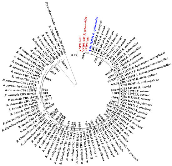 Maximum likelihood phylogenetic tree of concatenated partial sequences of ITS, LSU, cmdA, gapdh, his3, rpb2, and tef1-α gene alignments of Ramularia species. Bootstrap values for the maximum likelihood and Bayesian posterior probabilities are shown above the branches. Mycosphaerelloides madeirae (CBS 116066) is used as an outgroup. The isolates YN1931401, YN1931402, and YN1931403 in this study were marked in red and the R. sphaeroidea that reported in 2015 was marked in blue.