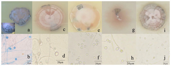 Morphological and cultural characteristics of R. sphaeroidea. (a,c,e,g,i) Colony morphology on PDA, OMA, LA-PDA, PCA, and CMA, respectively. (b,d,f,h,j) Subglobose to globose conidia on PDA, OMA, LA-PDA, PCA, and CMA, respectively. Scale bar = 20 μm.