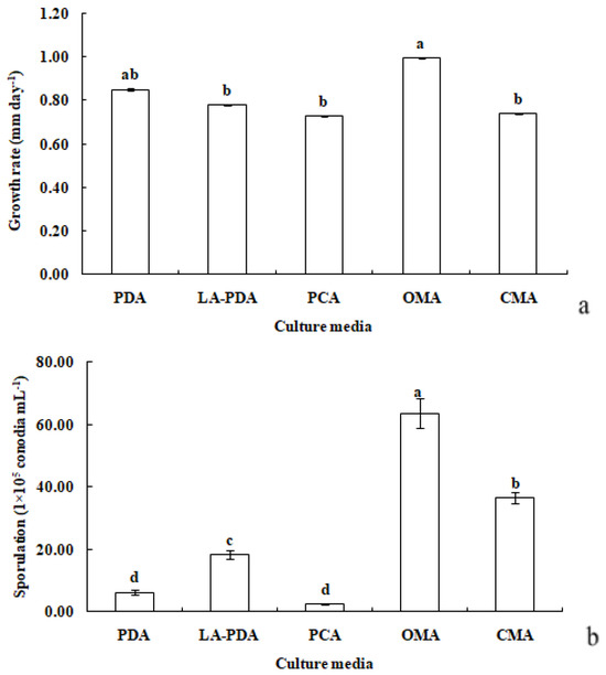 Growth rate (a) and sporulation (b) of R. sphaeroidea in five types of culture media. The same lowercase letter indicates no significant difference between treatments at p ≤ 0.05, according to Tukey’s HSD.