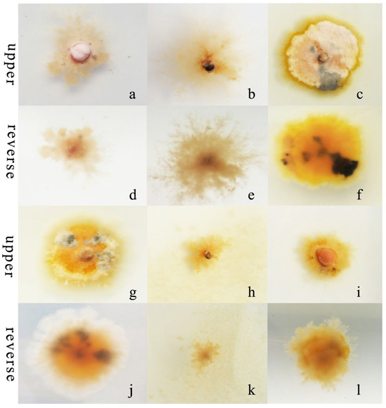 Morphological and cultural traits of R. sphaeroidea. (a–c,g–i) Colony morphology on the upper side of glucose, sucrose, lactose, D-fructose, starch, and maltose, respectively. (d–f,j–l) Colony morphology on the reverse side of glucose, sucrose, lactose, D-fructose, starch, and maltose, respectively.