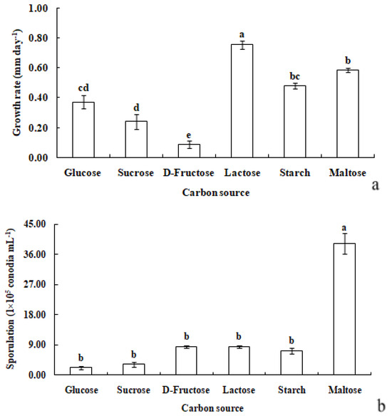 Growth rate (a) and sporulation (b) of R. sphaeroidea on six types of carbon media. The same lowercase letter indicates no significant difference between treatments at p ≤ 0.05 according to Tukey’s HSD.