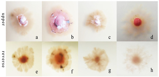 Morphological and cultural characteristics of R. sphaeroidea. (a–d) Colony morphology on the upper side of media that contained potassium nitrate, ammonium nitrate, ammonium chloride, and peptone, respectively. (e–h) Colony morphology on the reverse side.