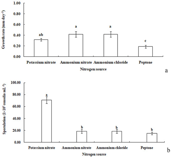 Growth rate (a) and sporulation (b) of R. sphaeroidea on four types of nitrogen media. The same lowercase letter indicates no significant difference between treatments at p ≤ 0.05 according to Tukey’s HSD.