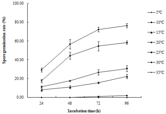 The conidia of R. sphaeroidea cultured on PDA medium germinated in temperatures from 15 to 30 °C (Figure 9). Spore germination occurred at 24 h at 15–30 °C. The spores produce one to three germ tubes after imbibition (Figure 10a). At 48 h, the bud tube was gradually elongated (Figure 10b). After 72 h, the elongated bud tube formed hyphae with one or more septa (Figure 10c). The optimal temperature for conidial germination was 30 °C. At 96 h after incubation, 30 °C resulted in the highest germination percentage (76.33%). Only a few conidia germinated at 10 °C (2.10%), and no conidia germinated at 5 °C and 35 °C (Figure 9).