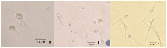 Conidial germination of R. sphaeroidea. (a) Spores produce 1–3 germ tubes. (b,c) The elongated bud tube formed hyphae with one or more septa.
