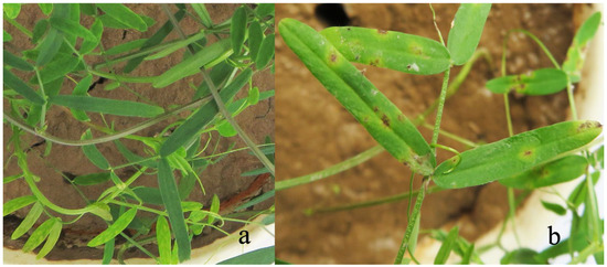 Hairy vetch leaves inoculated with R. sphaeroidea after 14 days. (a) Control and (b) hairy vetch inoculated with conidia.
