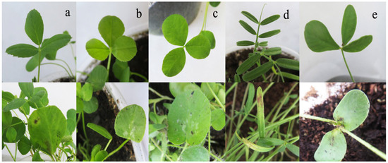 Reaction of five perennial legume plants to R. sphaeroidea with irregular brown to dark brown spots 2 weeks after inoculation. (a) An alfalfa seedling on the lower panel is inoculated with R. sphaeroidea, and the seedling on the upper panel is the control. (b) A white clover seedling with and without inoculation. (c) A red clover seedling with and without inoculation. (d) A common vetch seedling with and without inoculation. (e) A sainfoin seedling with and without inoculation.