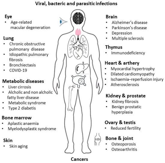 Age-related immune system changes are grouped under the term “immunosenescence”, used over the years to define “the state of dysregulated immune function that contributes to the increased susceptibility of the elderly to infections and, possibly, autoimmune diseases and cancer” [12]; “the changes in the immune system associated with age” [13]; and “a gradual and subjective decline of the immune system and host defense mechanisms” [14]. More generally, immunosenescence refers to a series of complex changes leading to altered innate and adaptive immune system functions which, overall, may result in a state of immunodeficiency [15]. Immunosenescence has been considered a harmful event for many years, due to its involvement in the progressive reduction in the ability to trigger effective antibody and cellular responses against infections and vaccinations. It has also been considered a negative process because it leads to a type of inflammation called “inflammaging”, which defines a reduction in the capability to cope with a variety of stressors and a progressive increase in the pro-inflammatory status [16]. Indeed, inflammaging is characterized by an unbalanced increase in systemic pro-inflammatory cytokines, such as interleukin (IL)-1, IL-6, and tumor necrosis factor (TNF)-α, and reduced levels of anti-inflammatory cytokines, such as IL-10, transforming growth factor-β [17]. Therefore, inflammaging is a chronic, asymptomatic, sterile, low-grade inflammation that occurs in old age in the absence of signs of infection. This chronic inflamed state was initially described as a harmful event with profound adverse health effects that contributed to biological aging and the development of age-related pathologies. In particular, senescent immune cells, by producing cytokines, chemokines, growth factors, proteases, and angiogenic factors, acquire the so-called “senescence-associated secretory phenotype” (SASP) [18]. The persistent and non-resolved production of pro-inflammatory mediators, concomitantly with the adoption of lifestyle factors, including smoking, obesity, alcohol, lack of exercise, and exposure to ultraviolet radiation, are known to increase the risk for age-related multi-organ/system diseases (Figure 1) [15,19,20,21,22] and premature morbidity and mortality.