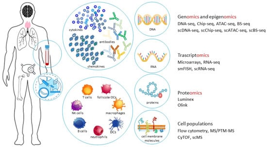 The “classic” study methods, resorting to the use of animal models, despite having highly contributed to unveiling relevant paradigms in immune system, have some imbedded limitations, such as genetic homogeneity, a synchronized day–night cycle, monotonous feeding, and exposure to a narrow spectrum of environmental stimuli. Therefore, animal modes lack those conditions that are so important for shaping the human immune repertoire [89]. Some investigations have used wild or pet store mice, which are maintained in hygienic conditions, which may recapitulate adult human immune challenges [90]. More recently, the issue of immune system variability has been addressed by a new approach, defined as “system immunology”, a branch of “systems biology” [91]. This methodology is based on the concept that various components of the immune system have a high degree of interdependence and interconnection. In a multihierarchical or multiscale organization, the components at a lower scale are integrated with the functional units of the immediately higher scale [92]. The variation in cell composition, plasma proteins, and functional responses in aging through a system immunology approach has been possible due to the introduction of high-throughput “omics” technologies [93]. This approach allows us to study, at both the single cell and population level, the behavior of genes and epigenetic modifications (genomics and epigenomics), mRNA (transcriptomics), and proteins (proteomics), and to quantify, in blood and tissues, the levels of immune system components, as well as the immune system cell markers, as summarized in Figure 3.