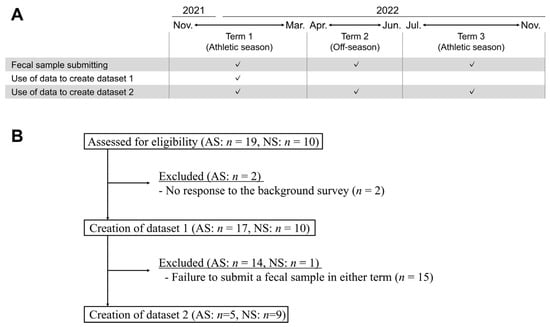 Study scheme and the generation of datasets. (A) Fecal samples were submitted from three distinct terms: Term 1 (T1), spanning from November 2021 to March 2022; Term 2 (T2), from April 2022 to June 2022; and Term 3 (T3), from July 2022 to November 2022. Fecal samples could be submitted more than once throughout this trial. In cases where multiple samples were available within a term, one was randomly selected. Two datasets were created: dataset 1 comprised samples submitted from T1; dataset 2 comprised samples from the three distinct terms. (B) Data from subjects who met the criteria were selected, and 27 and 14 subjects were finally recruited for datasets 1 and 2, respectively. Abbreviations: athletic subjects (AS), non-athletic subjects (NS).