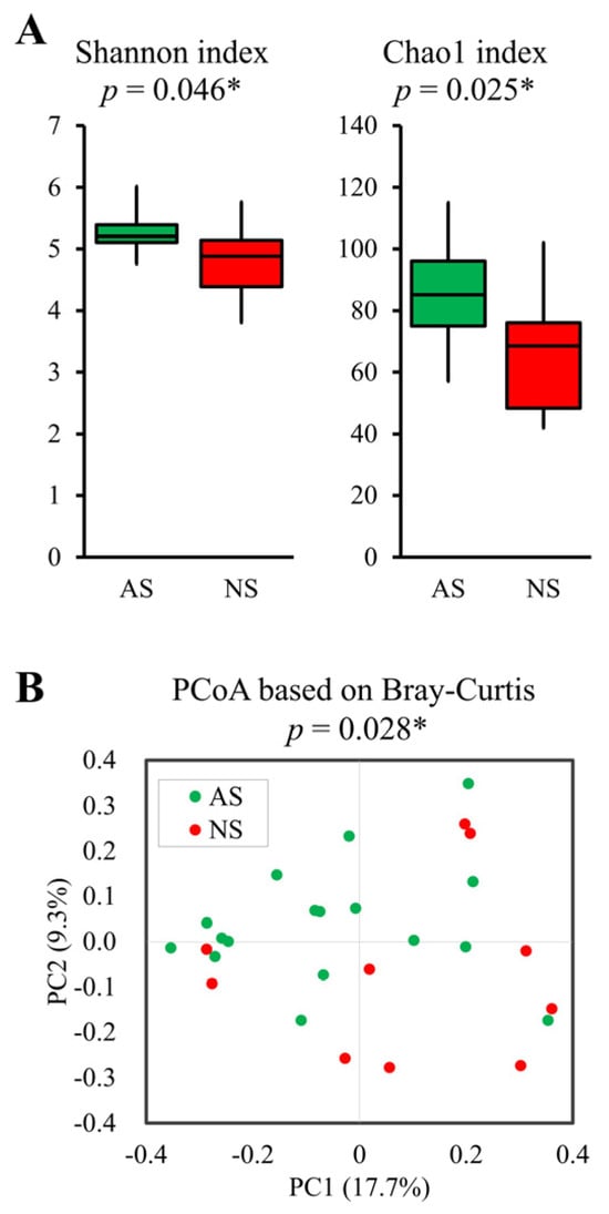 The Shannon (p = 0.046) and Chao1 (p = 0.025) indices, representing alpha-diversity, were significantly higher in AS compared with NS (Figure 2A). Furthermore, PCoA based on Bray–Curtis dissimilarity metrics also indicated significant differences (p = 0.028, Figure 2B).