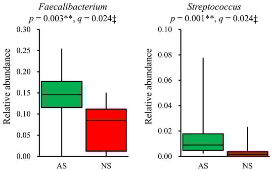 Significant differences in genera present in the gut microbiota between AS and NS. Among 19 dominant genera (>1%), Faecalibacterium and Streptococcus showed significant differences between AS (n = 17, green) and NS (n = 10, red), as presented by box plots. Statistical analysis was performed using the Mann–Whitney U test and the Benjamini–Hochberg procedure, with p < 0.05 and q < 0.05 considered statistically significant: ** p < 0.01, ‡ q < 0.05.