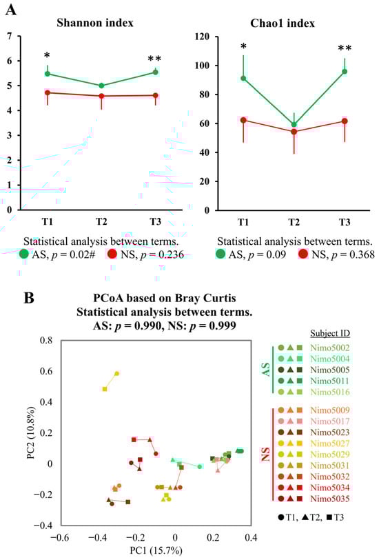 Longitudinal analysis of alpha- and beta-diversity between the athletic season and the off-season. (A) Alpha-diversity in AS (n = 5, green) and NS (n = 9, red) was measured using the Shannon and Chao1 indices. The data are expressed as the mean and the standard deviation. Statistical significance was assessed using the Mann–Whitney U test and the Friedman test for comparisons between groups (* p < 0.05, ** p < 0.01) and between terms (# p < 0.05), respectively. (B) PCoA plots showing the beta-diversity with Bray–Curtis dissimilarity. The samples are represented by individual dots, with shades of green representing AS (n = 5: Nimo5002, Nimo5004, Nimo5005, Nimo5011, and Nimo5016), shades of red representing NS (n = 9: Nimo5009, Nimo5017, Nimo5023, Nimo5027, Nimo5029, Nimo5031, Nimo5032, Nimo5034, and Nimo5035), circles (●) representing T1, triangles (▲) representing T2, and squares (■) representing T3. The differences between the terms were analyzed using PERMANOVA. Abbreviations: T1, Term 1 (athletic season); T2, Term 2 (off-season); T3, Term 3 (athletic season).