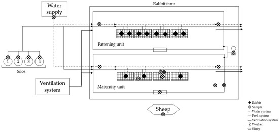 Schematic diagram of the rabbit farm and sample collection points.