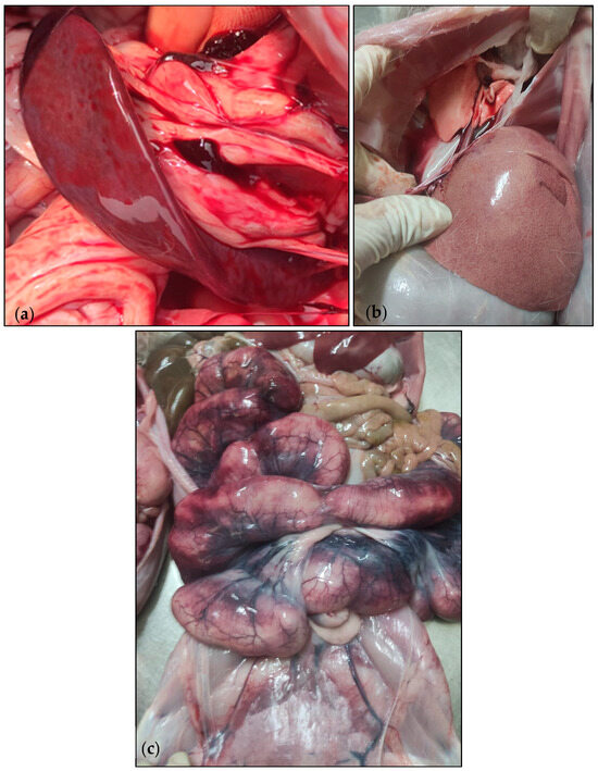 On 26 July 2023, an increased mortality rate among does was observed during the peripartum period, wherein 60 does died within 2 days, resulting in a 6% mortality rate. This is notably higher when compared to the historical records of this rabbit farm, which indicated an average peripartum mortality rate for does ranging from 2 to 3% over the past few years. In addition, 1200 stillborns were recorded. The clinical presentation predominantly consisted of anorexia, lethargy, vaginal purulent discharge, and intra-uterine foetal death. Eight days before the onset of these symptoms, does presented a respiratory infection and were receiving treatment with sulfadimethoxine-trimethoprim through their feed (4 kg/ton of feed). The antibiotic treatment lasted for 15 days and was still ongoing during the outbreak. It is worth noting that the fattening rabbits and the sheep did not display any clinical symptoms and were not subjected to antibiotic therapy. The post-mortem examination of the affected does reveal splenomegaly (Figure 2a), hepatomegaly with a reticular pattern (Figure 2b), and pulmonary congestion. Additionally, haemorrhagic lesions were observed in the uterus (Figure 2c), with thickening of the uterine wall and a mucosal covered in purulent greyish exudates. Nonetheless, the management of this clinical case was conducted on the veterinarian’s experience and routine therapy plan and was not influenced in any way by this study.