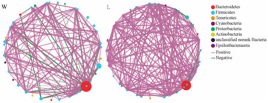 In Figure 1, the node size represents the species abundance, and the color of the links represents positive or negative correlations, with purple indicating positive correlations and green indicating negative correlations. The thickness and number of lines represent the correlation between species. The results showed that the W group had 39 nodes, with 28 nodes belonging to the Firmicutes phylum, accounting for 71.79%. There were 121 edges, with 101 positive correlations accounting for 83.47% and 20 negative correlations accounting for 16.53%. On the other hand, the L group had 38 nodes, with 30 nodes belonging to the Firmicutes phylum, accounting for 78.95%. There were 172 edges, with 169 positive correlations accounting for 98.26% and 3 negative correlations accounting for 1.74%. This indicates that the gut microbiota network in the L group is more complex, with tighter connections between microorganisms compared to the W group.