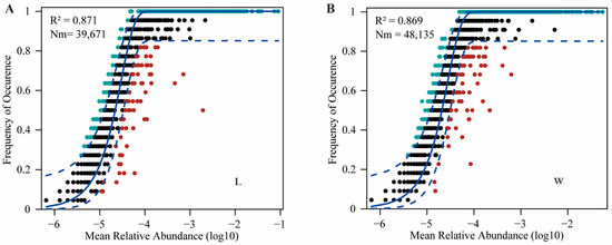 The neutral community model (NCM) quantifies the importance of neutral processes (Figure 2). The results showed that the NCM successfully estimated the relationship between the occurrence frequency of OTUs and their relative abundance changes, with high explanatory power in both field conditions and indoor rearing processes (R2 > 0.85). This indicates that random processes are crucial for the assembly of gut microbiota communities in plateau zokors. Additionally, the Nm values (Nm = 48,135) of gut microbiota in the W group were higher than those in the L group (Nm = 39,671), suggesting a higher level of species dispersal in the wild for plateau zokor gut microbiota compared to captivity.