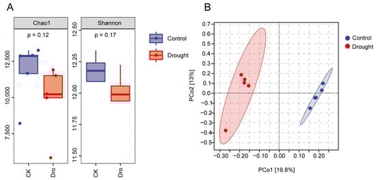 Analysis of bacterial diversity in the Arabidopsis rhizosphere. (A) The Chao1 index and Shannon index show α diversity and richness at the ASV level. (B) Principal coordinate analysis (PCoA) of bacteria in the Arabidopsis rhizosphere based on the Bray–Curtis distance and unweighted UniFrac matrix at the ASV level. Each dot represents a sample. Blue dots correspond to the normal watering treatment (control), and the red dots correspond to the drought treatment.