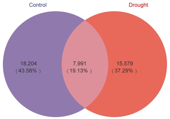 The Venn diagram in Figure 3 compares the bacterial ASVs detected in the rhizosphere of A. thaliana in the control and drought treatments. Only 19.3% of the ASVs were shared between the treatments, indicating that rhizosphere bacterial community composition differed greatly between the treatments, even though the difference in species diversity between the treatments was not significant. In addition, the total number of ASVs decreased by 2625 (10.02%) in the drought treatment compared with the control.