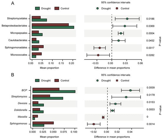 STAMP analysis was performed to analyze the differences in rhizosphere bacterial community composition at the order (Figure 4A) and genus (Figure 4B) levels. The orders Streptomycetales, Betaproteobacteriales, Micropepsales, and Caulobacterales were enriched under drought stress, whereas Sphingomonadales and Micrococcales were enriched in the control. Six of the top ten genera differed significantly in relative abundance between the treatments, of which four were enriched under drought stress: BCP, Streptomyces, Devosia, and Dokdonella. Although these differences were observed at the relative abundance level and are not absolutely quantitative, enrichment suggests a positive response to drought stress.