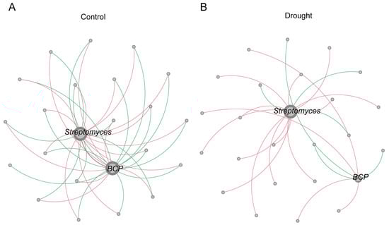 Co-occurrence network analysis of the Streptomyces and BCP in the (A) normal watering (control) treatment and (B) drought treatment. Each node in the network represents a bacterial population. The size of the node represents the degree of connection of each ASV. Pink connections between nodes indicate positive correlations, whereas green connections indicate negative correlations.