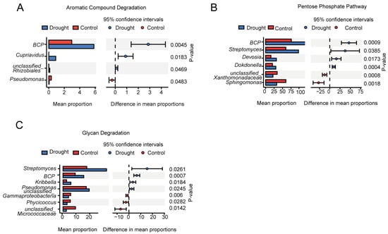 PICRUSt2 was used to predict the functions of the rhizosphere bacterial community. PICRUSt2 is based on non-metric multidimensional scaling (NMDS), which, similar to PCoA, simplifies the data structure by reducing the dimension of the sample distance matrix. However, unlike PCoA, NMDS is not affected by the sample distance and considers only size relationships. Thus, for data with complex structures, the ranking results of NMDS may be more stable than those of PCoA. The NMDS ordination showed a significant separation of the functional composition of the bacterial community between the drought and control treatments (stress = 0.023; r = 0.624; p = 0.019) (Appendix A Figure A2). An analysis of the abundances of genes encoding enzymes showed that nitrogenase, catalase, and 1-aminocyclopropane-1-carboxylate (ACC) deaminase were significantly increased under drought stress, further supporting the positive role of rhizosphere bacteria in plant drought resistance. Heatmap cluster analysis of the drought response (Figure 8) revealed increases in rhizosphere bacterial functions related to the metabolism of a wide range of carbohydrates, including pentose, glycans, and aromatic compounds, suggesting an increase in the range of utilizable carbon substrates. Compared with the drought treatment, the control treatment had more functions related to bacterial survival, such as biosynthesis, generation of precursor metabolites and energy, detoxification, cofactors, prosthetic groups, electron carriers, vitamin biosynthesis, nucleoside and nucleotide biosynthesis, cell structure biosynthesis, TCA cycle, fermentation, and antibiotic resistance. To further explore the core bacteria in the functional modules of drought enrichment, three metabolic pathways of polysaccharide degradation were selected for STAMP species composition difference analysis: aromatic compound degradation (Figure 9A), the pentose phosphate pathway (Figure 9B), and glycan degradation (Figure 9C). This analysis indicated that the enrichment of these metabolic pathways in the drought treatment compared to the control was associated with significant increases in the relative abundances of BCP and Streptomyces.