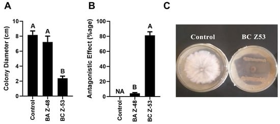 Analysis of the antagonistic potential of rhizospheric bacteria. (A,B). Inhibition percentage of antagonistic bacterial strains. (C). Qualitative screening of antagonistic bacterial strains. Vertical bars represent standard error. Different capital letters show significant differences among treatments at p = 0.05. BA = B. aryabhattai Z-48; BC = B. cereus.