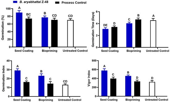 Analysis of the effect of coating on seedling quality of tomato. Vertical bars represent standard error. Different capital letters show significant differences among treatments at p = 0.05. Process control for seed coating represents the coating of seeds with coating material without bacteria and for biopriming represents seeds dipped in water only without bacteria.