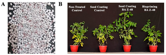 Effect of seed coating and biopriming on the growth of tomato plants. (A) = Coated seeds of tomato plants. (B) = Mature tomato plants raised from coated and bioprimed seeds of tomato by Bacillus aryabhattai Z-48.