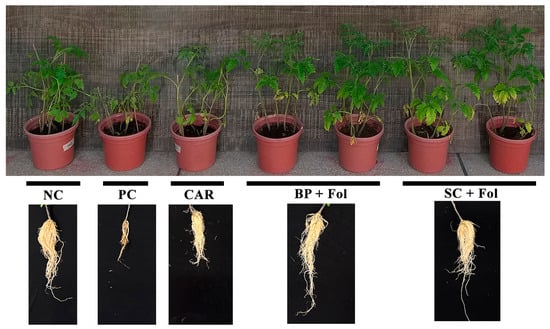 This pot trial was intended to observe the potential of seed coating with bacteria to manage Fusarium wilt disease. The tomato plants were raised from coated, bioprimed, or non-treated seeds in pots filled with sterilized potting media according to experimental design. The aqueous conidial inoculum of Fol was prepared as described in our previous publication [22]. After four weeks of emergence, Fol conidial suspension (50 mL) was injected around the roots of the plants. The experiment consisted of untreated control, pathogen control (Fol), coating with B. aryabhattai Z-48 + FOL, biopriming with B. aryabhattai Z-48 + Fol, coating process control + Fol, biopriming process control + Fol, fungicide control (Carbendazim @ 15.g/L) + Fol. The plants were incubated under the same conditions as mentioned in Section 2.4. Each treatment consisted of ten biological replicates and the experiment was performed twice.