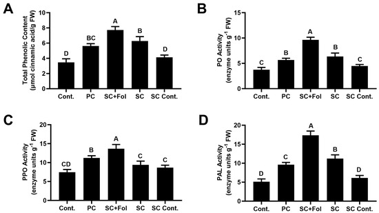 The effect of different treatments of bacterial seed coating on the defense mechanisms in tomato plants. Vertical bars represent standard error. Different capital letters show significant differences among treatments at p = 0.05. Cont. = non-treated control plants. (A) Quantification of total Phenolic Content; (B) Peroxidase Activity; (C) Polyphenol oxidase Activity; (D) Phenyl alanine ammonia lyase Activity. PC = pathogen control. SC = seed coated with B. aryabhattai Z-48. Fol = F. oxysporum f.sp. lycopsrsici. SC Cont. = seed coating without B. aryabhattai Z-48 to serve as seed coating process control.