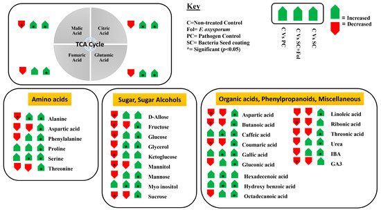 Metabolic pathway model of changes in tomato metabolome mediated by seed coating with B. aryabhattai Z-48 and Fusarium wilt pathogen. The green arrow shows increased production of metabolite whereas the red shows decreased production. The data presented here were derived from non-targeted GC/MS analysis of tomato plants raised under different treatments. Quantitative analysis was performed among different treatments and compared to the non-treated control plants. The quantities of each metabolite among replicates were averaged. Five biological replicates were used to derive the data. (*) = Significant difference (p > 0.05).