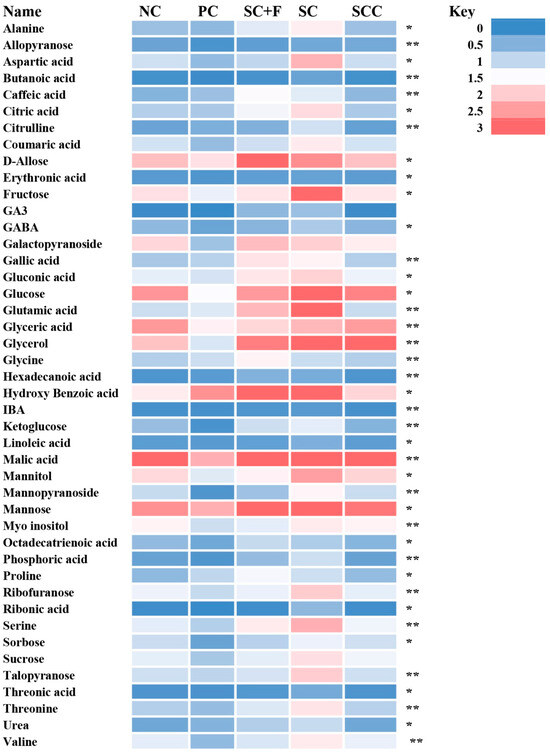 Heatmap of relative metabolite levels in the leaves of tomato plants raised from coated seeds with B. aryabhattai Z-48 and exposed to Fusarium wilt pathogen. NC = non-treated control; PC = pathogen control; SC = seed coated with B. aryabhattai Z-48; F = Fol; and SCC = seed coating control. * = p > 0.05; ** = p > 0.01.