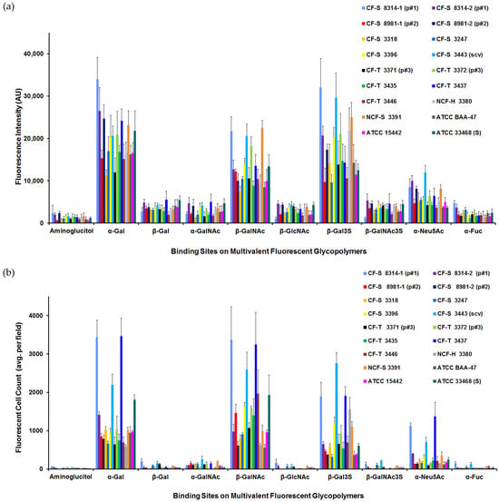 All eighteen P. aeruginosa showed significant binding to the glycopolymers specific for monosaccharides α-D-galactose (α-Gal), β-D-N-acetylgalactosamine (β-GalNAc), and β-D-galactose-3-sulfate (β-Gal3S). Several strains bound to α-D-N-acetylneuraminic acid (α-Neu5Ac) modestly, as evaluated by fluorescence intensity (Figure 2a), and three cultures showed significant binding to this glycopolymer by fluorescent cell counts (Figure 2b). The binding data for each strain of P. aeruginosa (as demonstrated in Figure 1 for CF-S 8314-1) showed that the anomeric configuration of the pendant monosaccharide was clearly determinative; i.e., α-Gal rather than β-Gal was preferred, and acetylated amino sugar β-GalNAc rather than α-GalNAc. With 3-O-sulfation, β-Gal3S was markedly preferred over β-Gal. In contrast, β-GalNAc3S-PAA-Fluor bound dramatically less than the non-sulfated galactosamine glycopolymer. Notably, there was little binding detected to the α-L-Fucose (α-Fuc) glycopolymer by any of the eighteen strains of P. aeruginosa, whether employing the commercially available α-Fuc-PAA-Fluor or the comparable glycopolymer synthesized and verified in-house.