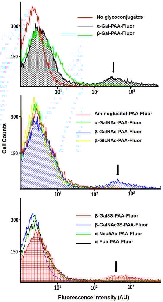 The carbohydrate-binding specificities of the polyacrylamide-based fluorescent glycopolymers used in this study were verified prior to use via a previously published method employing lectin-coated agarose beads and fluorescence microscopy [119]. Lectin beads used and the specificities are as follows: Griffonia simplicifolia lectin I for α-Gal; Erythrina cristagalli lectin for β-Gal; soybean agglutinin for GalNAc; Limulus polyphemus lectin for α-Neu5Ac; wheat germ agglutinin for β-GlcNAc; and Aleuria aurantia lectin for α-L-Fuc. The protocol followed this example: a slurry of soybean agglutinin-coated agarose beads (100 µL) was pre-washed with phosphate-buffered saline (PBS) (3 × 1 mL) and resuspended in 0.5 mL PBS-Ca (PBS with 1 mM CaCl2), prior to the addition of 20 µL of sodium phosphate buffer (0.3 M, pH = 7.4) containing 10 µg of α-GalNAc-PAA-Fluor. Incubation proceeded at 35 °C for 1 h with gentle mixing, and was followed by gentle centrifugation (2000× g at 4 °C, for 3 min) and two rinses with PBS (1 mL PBS). The rinsed beads were resuspended in 200 µL of PBS and observed by fluorescence microscopy for the presence of bound fluorescent PAA-glycopolymer.