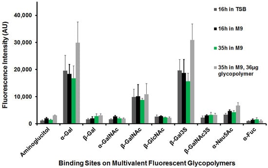 Bacterial-glycopolymer binding was routinely detected via spectrofluorometry and fluorescence microscopy. Fluorescence intensity (arbitrary units, AU; λex/λem = 490/520 nm, slit width = 10 nm) and optical density (OD600 nm) of rinsed glycopolymer-bound bacterial suspensions were measured in a multi-mode microplate spectrophotometer (Synergy MX, BioTek, Winooski, VT, USA). Fluorescence signals were normalized to sample optical densities. To permit comparisons across glycopolymers and strains, after subtracting the values from the parallel samples without glycoconjugates, the sample data were then normalized to adjust for the fluorescence indices of the respective PAA-Fluor glycopolymers. Fluorescence indices of polymers with pendant monosaccharides, normalized to the aminoglucitol control polymer, ranged from 0.61 to 1.63, and are as follows: α-Gal, 0.61; β-Gal, 0.88; α-GalNAc, 1.24; β-GalNAc, 1.63; β-GlcNAc, 1.1; β-Gal3S, 0.69; β-GalNAc3S, 0.86; α-Neu5Ac, 0.98; and α-Fuc, 1. Data were reported as fluorescence intensities for triplicate bacterial binding experiments and plotted with standard deviations (STDEV) using Microsoft Excel 2016 software.