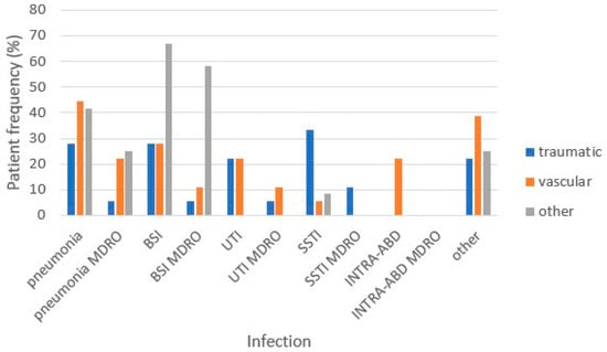 Rate of pts/HAI-MDRO HAI type and etiology of severe acquired brain injury. MDRO: multidrug-resistant organisms, BSI: bloodstream infection, UTI: urinary tract infection, SSTI: systemic soft tissue infection, INTRA-ABD: intra-abdominal infection.