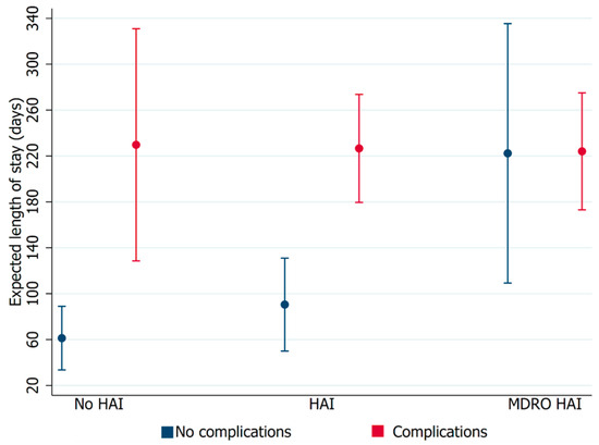 Relationship between length of stay and the presence of complications in patients with healthcare-associated infections (HAIs) or multidrug-resistant organism healthcare-associated infections (MDRO HAIs). Error bars represent 95% confidence intervals.