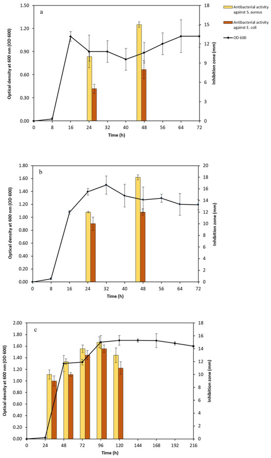 Following the identification of the selected isolates, such as Bacillus (Kh2 and Kh5 strains) and Saccharomonospora (Kh3 strain), the physiology of their growth in respective culture media and simultaneously their antibacterial activity were examined. The incubation temperature was set to 45 °C, and the duration of incubation ranged from 1 to 9 days. The study of the growth pattern of two Bacillus sp. strains, Kh2 and Kh5, was checked in the TSB medium. The analysis of growth curves revealed that both strains had a lag phase followed by a log phase. Strains Kh2 and Kh5 entered the exponential phase approximately 10 h after the initial inoculation. The stationary phase was determined at 18 h and 22 h for strains Kh2 and Kh5, respectively (Figure 4a,b). Similarly, the growth pattern of strain Kh3, identified as S. azurea, was examined in the ISPII medium. After 24 h from the initial inoculation, this strain passed in the log phase, and its stationary phase was detected after 6 days (Figure 4c).