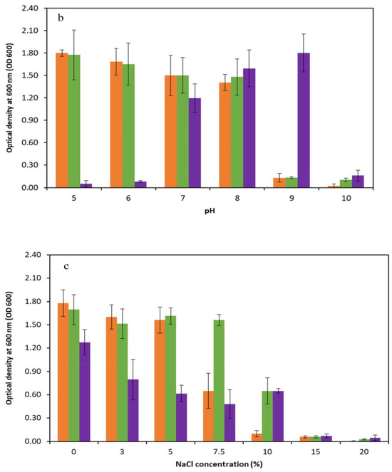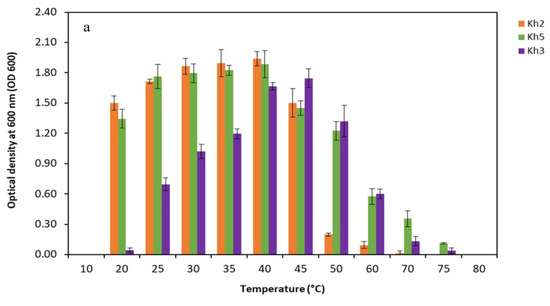 In order to assess the physiological characteristics of the promising thermophilic strains (Kh2, Kh3, and Kh5), an extensive investigation was conducted to determine their cardinal temperature and pH values, as well as their tolerance to various NaCl concentrations. The temperature range for the strains was systematically studied, covering a wide spectrum from 10 °C to 75 °C. Through particular observation, it was found that the optimal temperature for growth varied amongst the strains. Specifically, Kh2 and Kh5 exhibited the highest growth rate at 40 °C, while Kh3 reached maximum growth at a temperature of 45 °C. Notably, no substantial differences in growth were observed within the temperature range of 20 to 40 °C for the Bacillus sp. strains. Moreover, the highest temperature that the Bacillus sp. strains (Kh2 and Kh5) and S. azurea strain Kh3 could tolerate was 60, 75, and 70 °C, respectively. Furthermore, no growth was observed for all strains at 10 °C (Figure 5a). After determining the optimal growth temperature for all strains, the suitable pH range for their growth was conducted. The obtained results indicated that Bacillus sp. strains (Kh2 and Kh5) preferred a wide range of pHs from 5 to 8 for their maximum growth. However, for the strain Kh3, it was revealed that the alkaline condition (pH 9) rather than acidic conditions was more favorable for its growth at 45 °C. In total, no considerable growth was detected at pH 9 and 10 for the other two strains (Figure 5b).