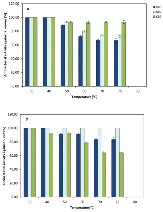 Antibacterial activity (%) of three selected strains (Kh2, Kh3, and Kh5) against (a) S. aureus and (b) E. coli after heat treatments in various temperatures.
