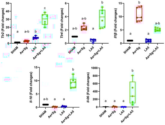 Infection with Aa+Sg increased mRNA levels of Il-1β. Administration of LA5 to otherwise non-infected animals led to the upregulation of Tlr2 but did not alter the transcription of other studied genes. There was no difference in Tnf expression levels among groups. However, administration of LA5 to Aa+Sg-infected animals led to the upregulation of Tlr2 and Tlr4, downregulation of Il-1β, and upregulation of Il-10 and Il-6 (Figure 2).