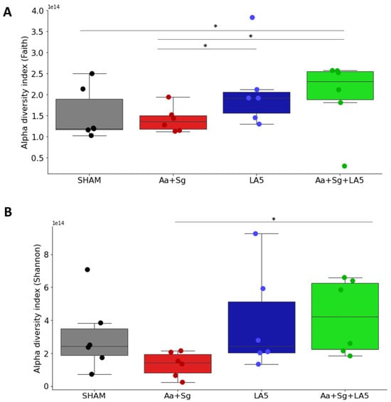 Alpha diversity analyses of the oral biofilm microbiome of C57Bl/6 mice of the following groups (n = 6): negative control (SHAM); positive control: A. actinomycetemcomitans and S. gordonii (Aa+Sg); probiotic control: L. acidophilus (LA5), and test: A. actinomycetemcomitans, S. gordonii and L. acidophilus LA5 (Aa+Sg+LA5). (A) Richness (Faith’s PD) index and (B) Richness Shannon index analyses * Kruskal–Wallis (p ≤ 0.05).