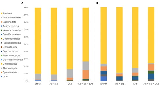 Microbial abundance of bacteria at the phylum level in the oral (A) and gut (B) microbiomes of C57Bl/6 mice. The following groups were examined: negative control (SHAM), positive control (A. actinomycetemcomitans and S. gordonii-Aa+Sg), probiotic control (L. acidophilus-LA5), and test group (Aa+Sg+LA5). ANCOM (*) indicates statistical differences in the oral microbiome for Planctomycetota. (ƚ) denotes statistical differences in the gut microbiome for Verrucomicrobiota. The Kruskal–Wallis test was performed, with utilized p-values: p < 0.05, p < 0.01, and p < 0.001.