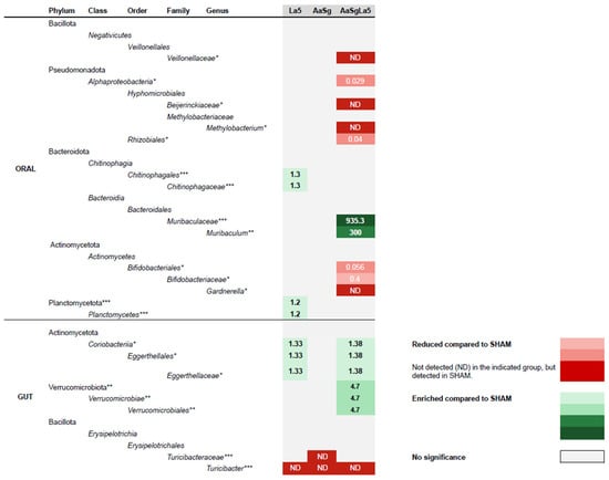 Disparities in the relative abundance (expressed as fold changes relative to SHAM) of bacterial taxa in the oral and gut microbiomes of C57Bl-6 mice across distinct groups: negative control (SHAM), positive control (A. actinomycetemcomitans and S. gordonii-Aa+Sg), probiotic control (L. acidophilus-LA5), and test group (Aa+Sg+LA5). Data were subjected to analysis via ANCOM, with the 75th percentile of the W distribution serving as the empirical cut-off value. Statistically significant differences among groups were validated using Kruskal–Wallis (* p < 0.05, ** p < 0.01, *** p < 0.001).