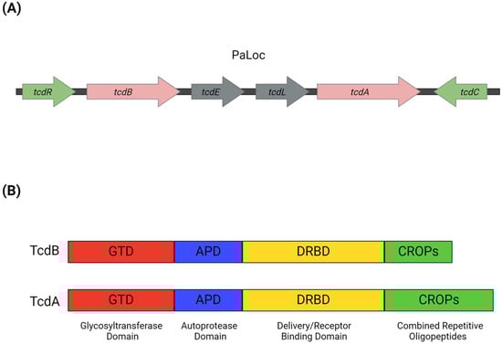 (A) Pathogenicity Locus (PaLoc). The genes tcdA and tcdB (pink arrows) encode the toxins TcdA and TcdB, respectively. The regulatory genes tcdR (positive) and tcdC (negative) modulate the transcription of tcdA and tcdB and are presented with green arrows. Genes tcdE and tcdL (grey arrows) encode a holin and an endolysin, respectively, which are involved in toxin secretion. The direction of the arrows represents the direction of transcription of the genes. (B) TcdA and TcdB are divided into four domains: the glycosyltransferase domain (GTD; red), the autoprotease domain (APD; blue), the delivery and receptor-binding domain (DRBD; yellow), and the combined repetitive oligopeptides (CROPs; green).