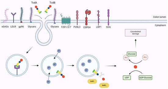 Both TcdA and TcdB interact with various human cell surface glycans via the CROPs domain. Initially, TcdA was reported to bind to sucrase-isomaltase enzyme sites in rabbit ileum, later identifying glycoprotein 96 (gp96) as an additional receptor on colonic epithelium []. Sulfated glycosaminoglycans (sGAGs) and low-density lipoprotein receptors (LDLRs) were also recognized as TcdA mediators. LDLR cooperates with sGAGs, facilitating TcdA binding and entry into host cells [,,]. TcdA likely binds to multiple receptors simultaneously for high-affinity cell entry, but further confirmation is required [].